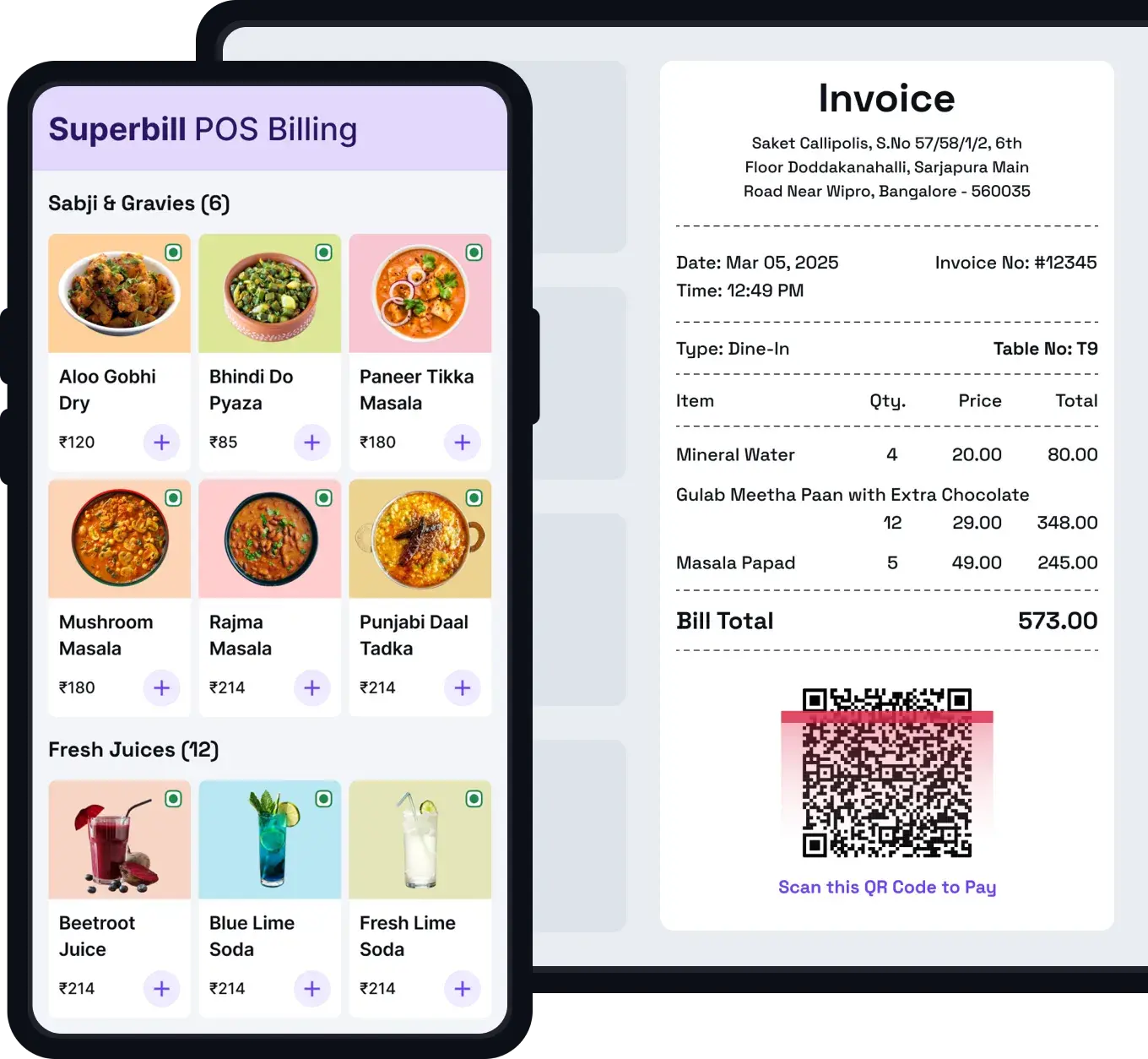 Manage orders, generate KOTs, and create GST-compliant bills in seconds. Superbill is designed for restaurants, cafes, food trucks, and cloud kitchens, with support for dine-in, takeaway, and delivery orders.